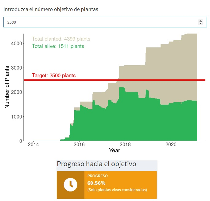 Esta aplicación te muestra el porcentaje de progreso que el proyecto alcanza actualmente con respecto al número objetivo de plántas que se introduzca en el espacio en blanco.