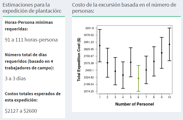 Los resultados de la estimación se muestran en dos recuadros adyacentes. El primero muestra las cifras del tiempo en horas por personas y días que se necesitarían para desarrollar la actividad, y un rango del costo total estimados para la expedición. En el segundo recuadro se encuentra un gráfico que muestra la relación del costo de la expedición con el número de personas utilizadas para el trabajo.